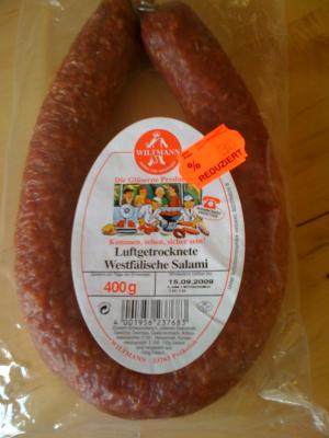 Nein, das kann keine Mettwurst aus Westfalen sein: Eingeschweißt, z.T. weiße Pelle, viel zu feinkörnig und überhaupt, eine westfälische Mettwurst gibt es nicht außerhalb von Westfalen!