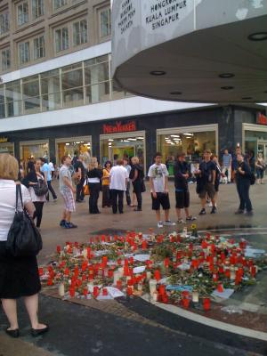 Man geht nichts ahnend über den Alexanderplatz... plötzlich eine Menschentraube, an der Weltzeituhr finden sich hunderte von Trauerkerzen, Briefchen und Blumen....