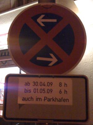 Tja, wenn man so ein Straßenschild sieht, in einer Gegend - sagen wir nur mal so zum Beispiel am Boxhagener Platz, wo man sowieso nie einen Parkplatz kriegt - sieht, dann ist wohl was besondneres los. Als ich am 1. Mai da lang ging (lässig auf der Suche nach ein wenig Ärger... aber es kam keiner, echt ärgerlich!) hangen sogar Schilder aus, die das mitführen von Flaschen und Dosen in einem zufällig genau um diesen Platz bezeichneten Areal verboten! Das sowas überhaupt möglich ist, war mir vollkommen neu! Wo bleiben unsere Grundrechte, wenn man nicht mehr wie jeder normale Bürger in F'hain mit einer Flasche Bier durch das Viertel ziehen darf ?